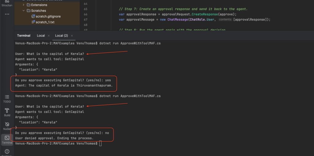 tools: [new ApprovalRequiredAIFunction(AIFunctionFactory.Create(GeographyTool.GetCapital))]