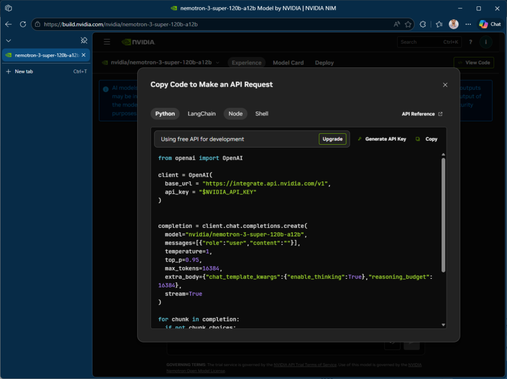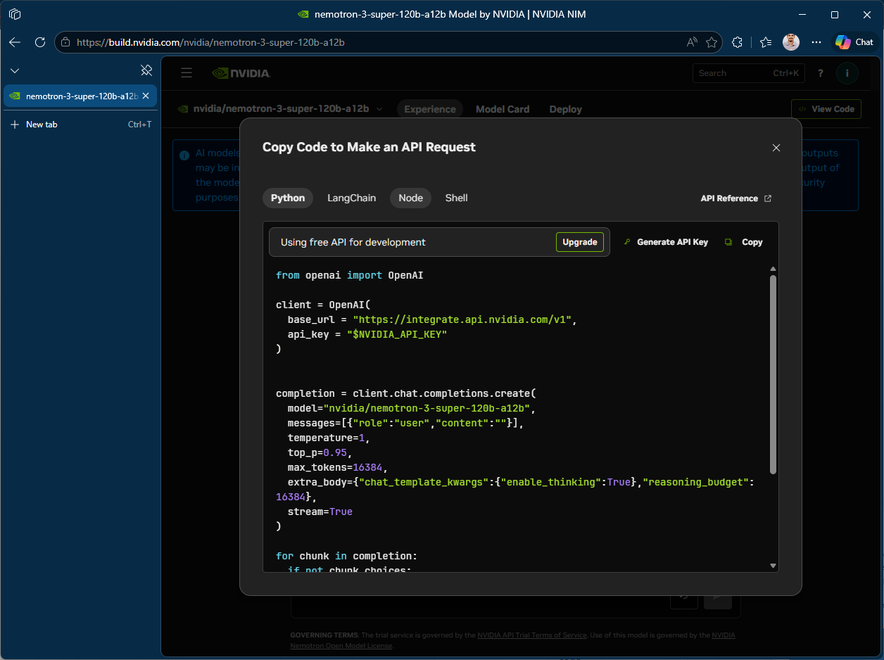 Keep in mind: API keys from build.nvidia.com are intended for technical verification and prototyping, not production use. For production, you can download NIM containers to self-host or scale through DGX Cloud .